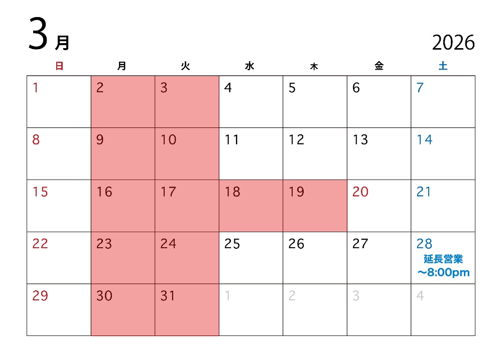 営業日はカレンダーをご覧ください