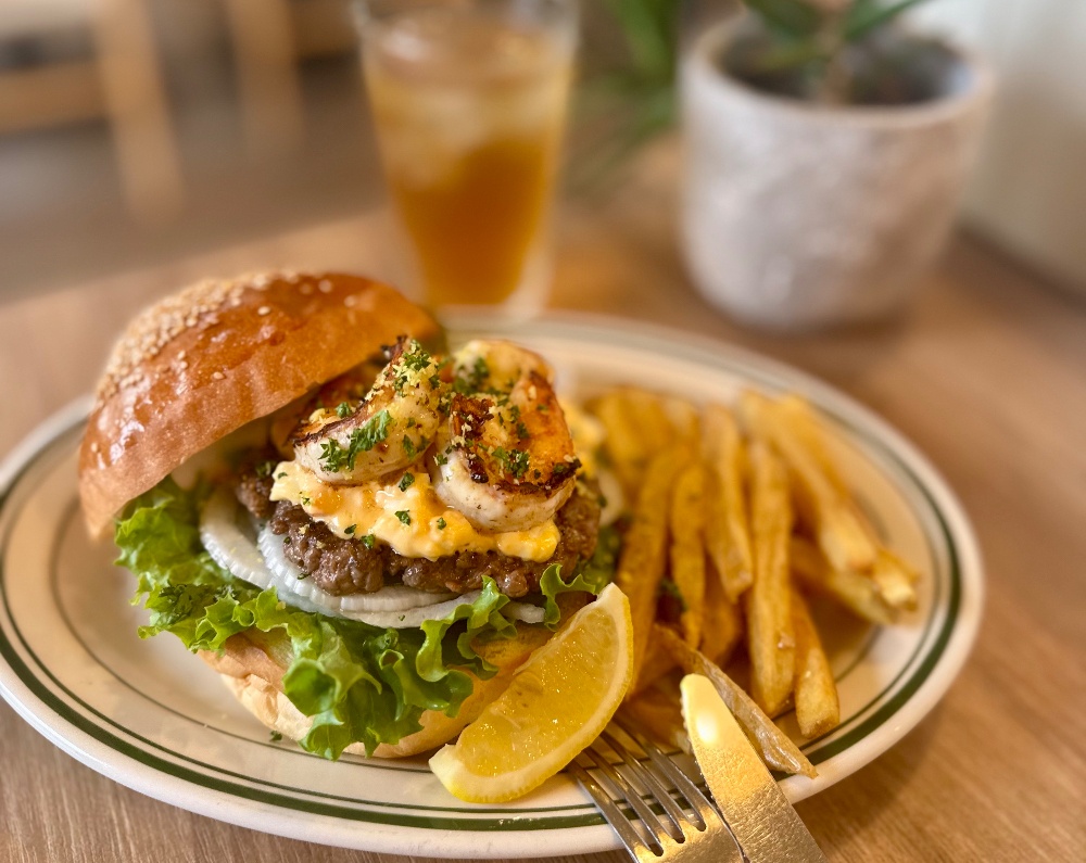4月はスプリングオニオン&シュリンプスキャンピバーガーですアメリカのシーフードレストランで必ず見かけるシュリンプスキャンピをこの時期食べておきたい新玉ねぎと合わせましたガーリックとバターソース、そしてカリフォルニアワインとレモンで仕上げたプリップリのシュリンプは牛100%パティとも相性抜群です新しいサーフ&ターフバーガーを是非お楽しみ下さい